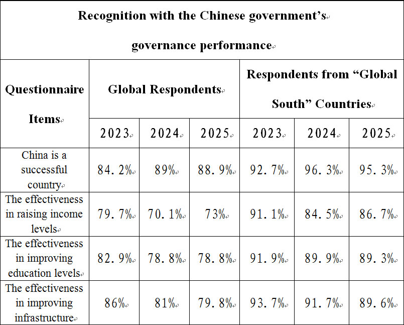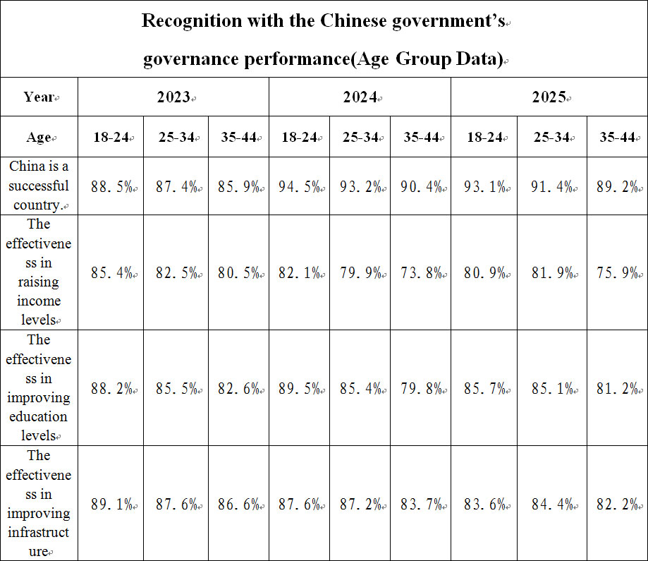 در نظرسنجی سال ۲۰۲۵، ۸۹.۵ درصد از پاسخدهندگان از قدرت اقتصادی قوی چین تمجید کردند و میزان تأیید در میان افراد زیر ۴۴ سال بیش از ۹۰ درصد بود. همچنین، ۸۹.۳ درصد چین را به دلیل حفظ نرخ رشد بالا تحسین کردند.